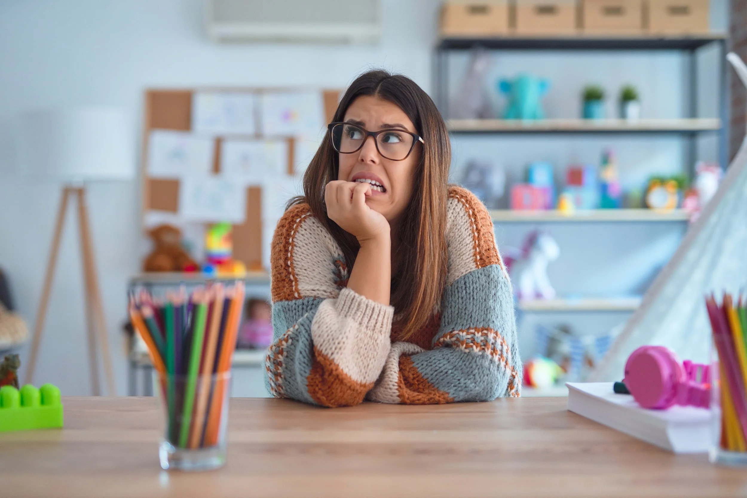 My curations tended towards photorealistic images. Since I wanted learners to feel they could end up in some of these situations, photo images would create a better immersion experience than vector illustrations. During this time, I found a particular photo of a teacher who looked overwhelmed but in a good-natured way. This photo inspired me to add some humorous bits with some of the images into the project and add a bit of fun to the learning experience.